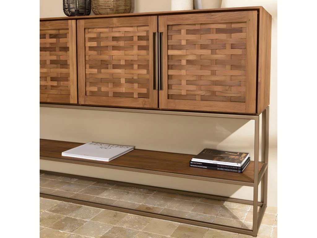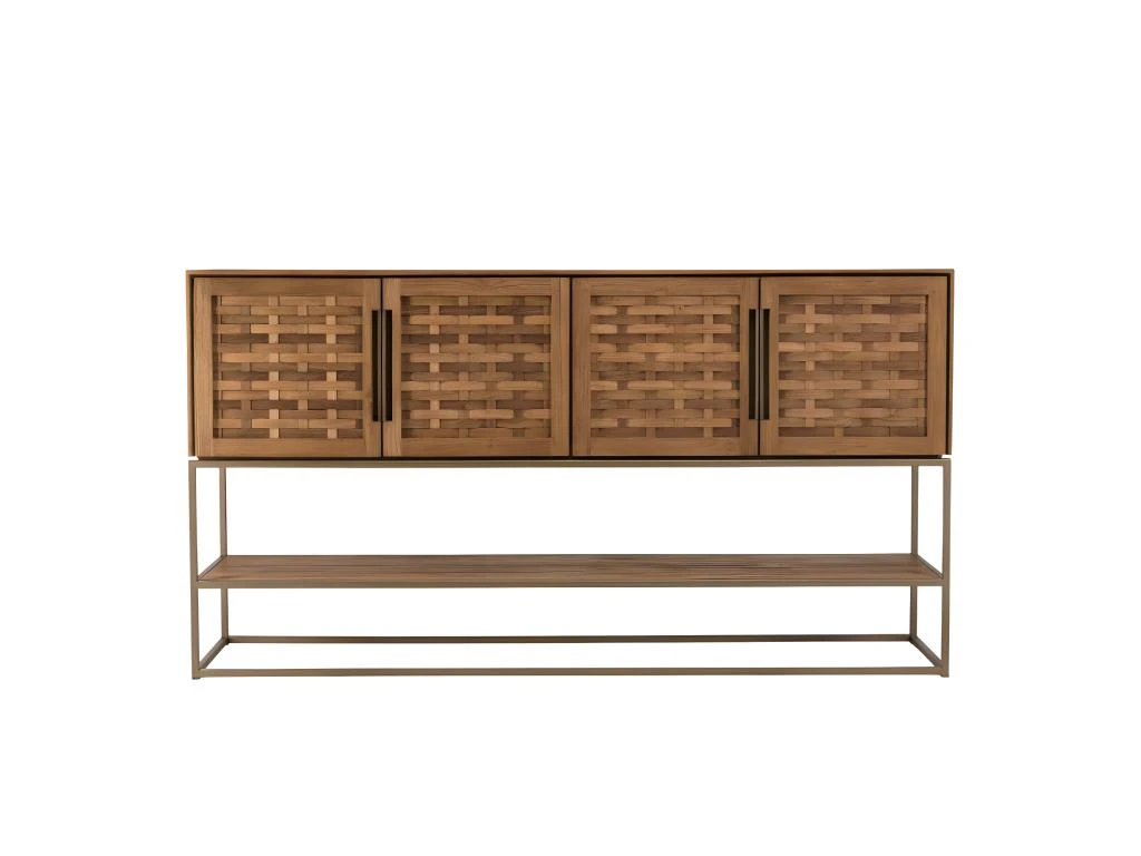 Buffet en bois de teck recyclé 4 portes en tissage de bambou. Dimensions : 205.5 x 40 x 110.7 cm. Article en Teck recyclé/Acier.