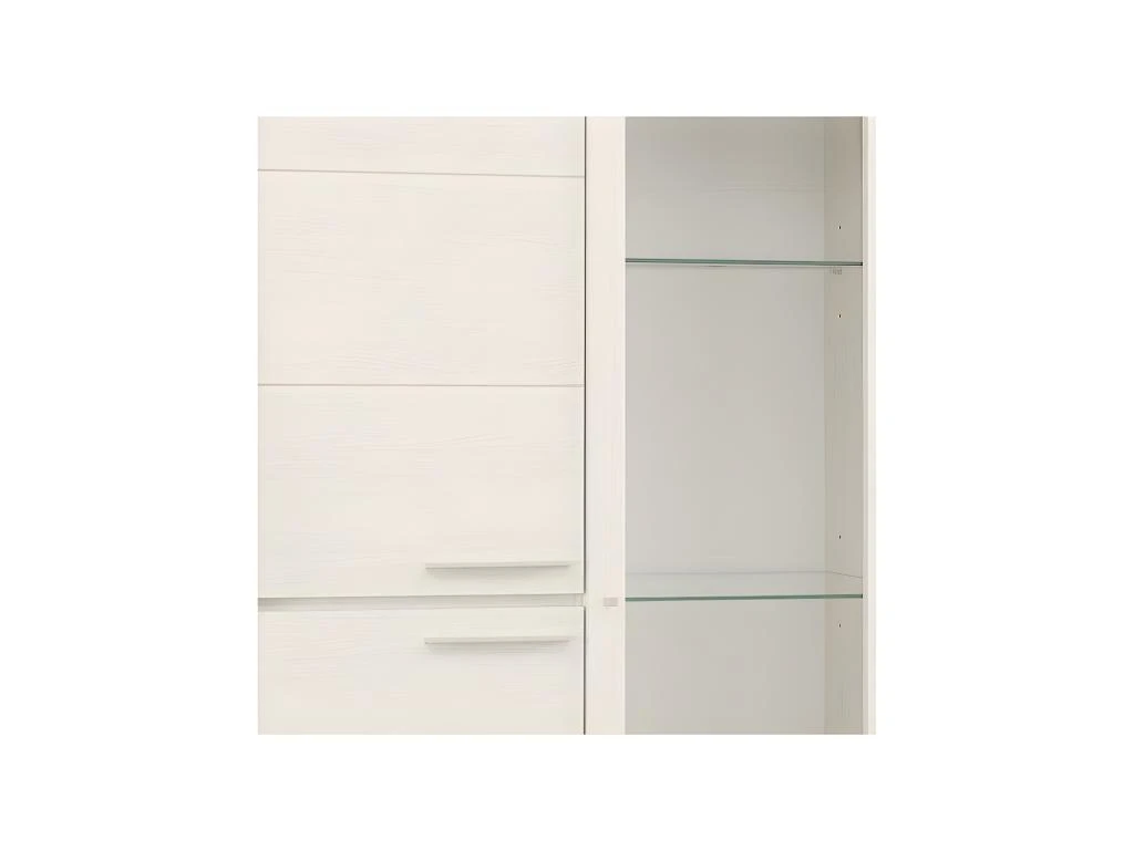 Vous rangerez ustensiles, quelques couverts, assiettes et pourquoi pas un aménagement bar derrière les 2 portes bois. La porte verre et les 3 étagères en verre permettront la mise en valeur de vos plus beaux verres et objets de collection.