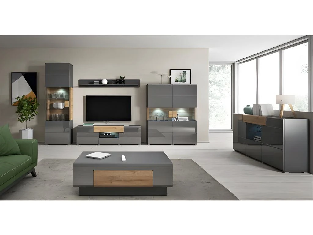 – COLORIS : Corps du meuble couleur gris anthracite. Façades grises brillantes. Façade tiroir effet chêne.