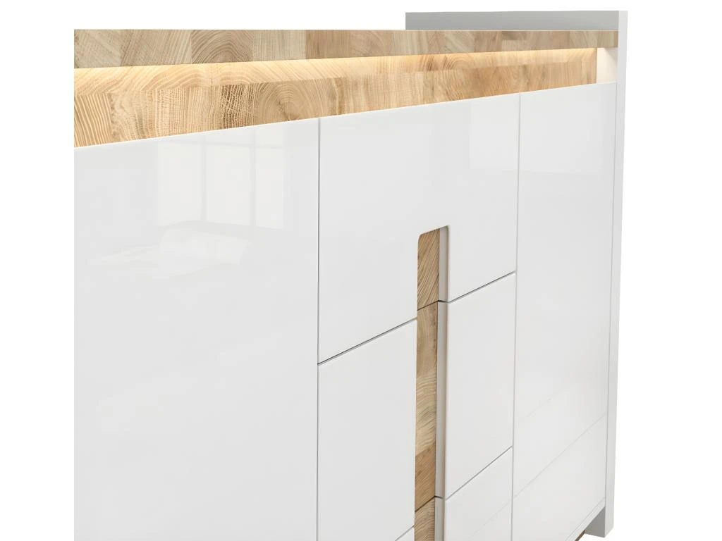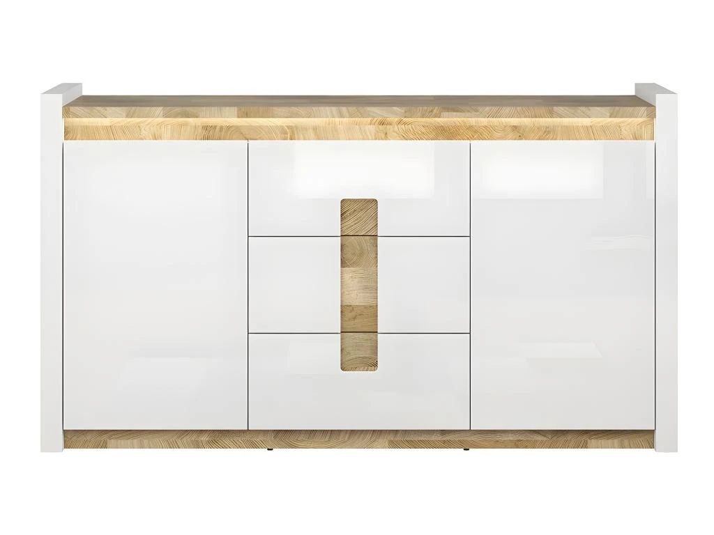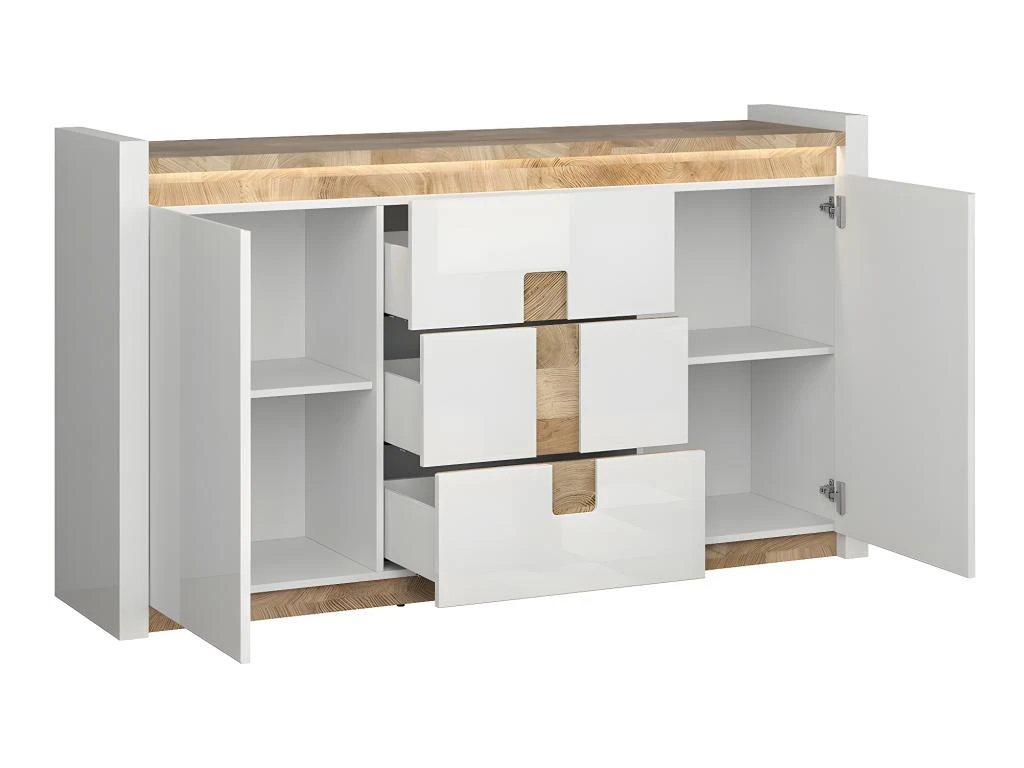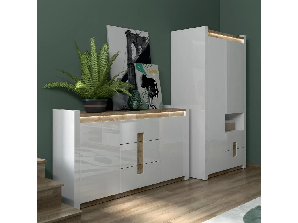 Caractéristiques : 2 portes – 3 tiroirs – 2 étagères amovibles – LED à brancher sur prise secteur avec un bouton – Portes équipées du système de fermeture silencieuse