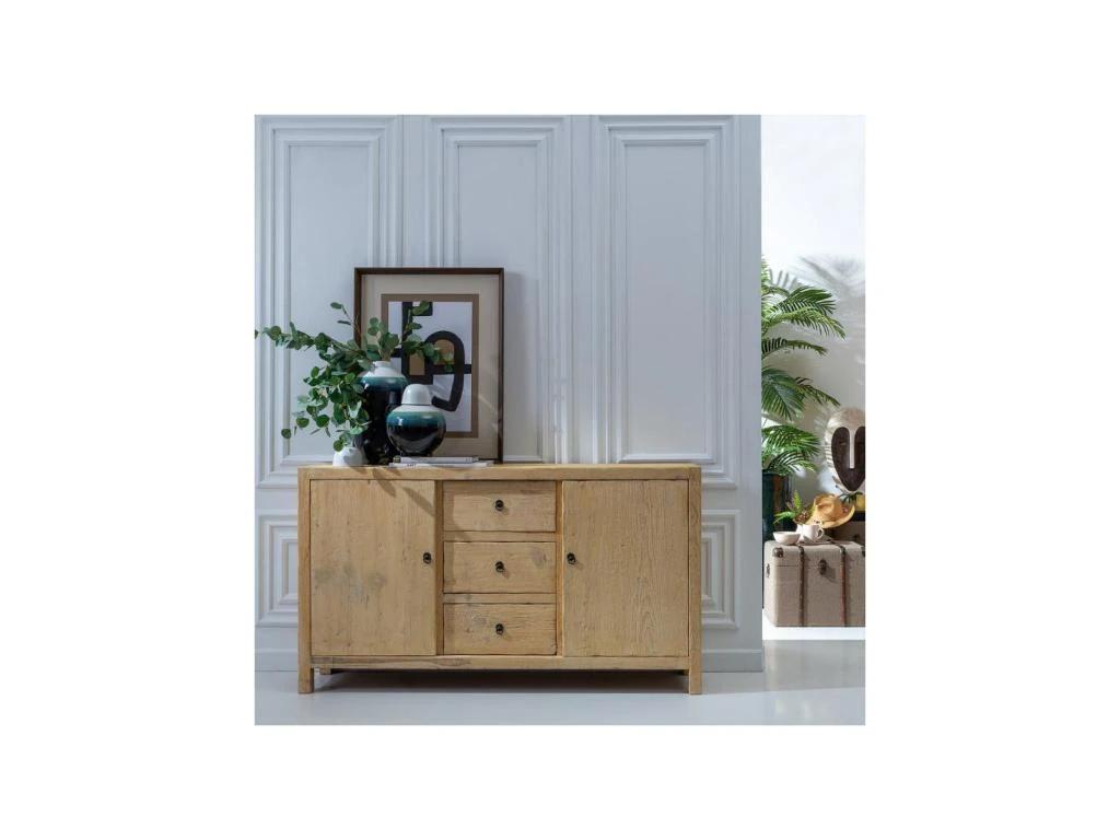 Lignes sobres et baeautĂ© du veinage du bois d’Orme pour ce buffet 2 portes 3 tiroirs.