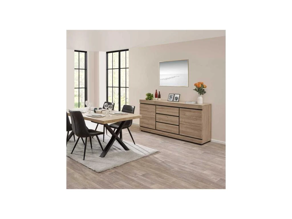 Mettant en avant un design modernisant et une proportion parfaite cette enfilade propose un revêtement Chêne naturel au veinage plus vrai que nature très nettement inspiré des meubles de tradition.