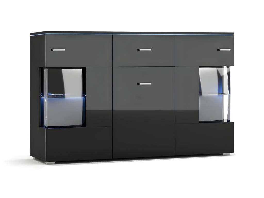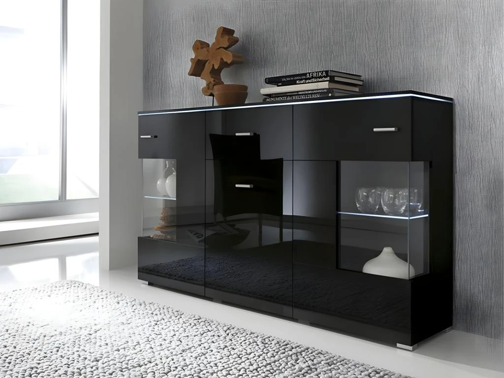Caractéristiques: 3 portes – 1 tiroir avec glissière à billes – 3 étagères dont 2 en verre – LED – Inclus – Lumière RGB (rouge, vert, bleu, blanc) – LED à brancher sur prise secteur – Télécommande avec fonctions allumer / éteindre et lumière fixe, dégradé ou clignotante