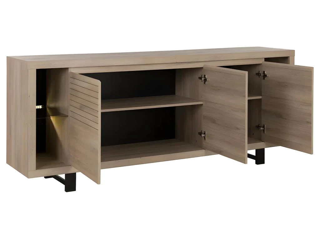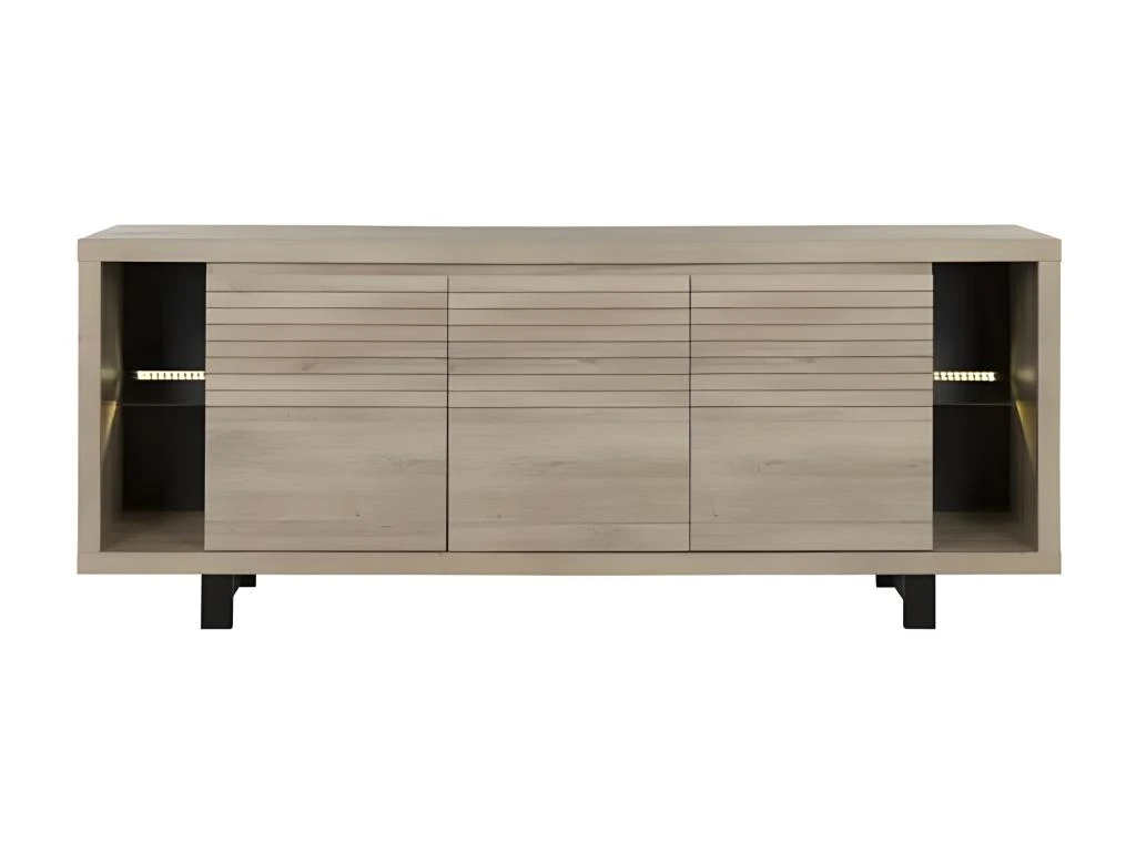 Le buffet 3 portes Clay est un meuble à la fois élégant et fonctionnel, parfait pour stocker votre vaisselle ou d’autres éléments de votre intérieur. Sa grande longueur de 220 cm et ses tablettes intérieures vous font bénéficier d’un espace de rangement maximal. Les niches latérales disposent d’une tablette en verre pour un rendu très contemporain. L’éclairage LED n’est pas inclus. Pieds en hêtre massif laqué noir. A monter soi même. Dimensions : L. 220 x l. 48 x H. 88 cm. Poids : 73,8 kg. Matière : Panneaux de particules. Marque : Gami.
