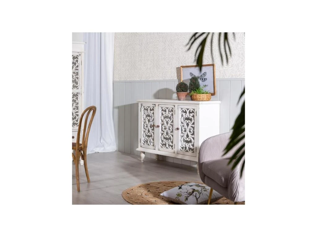 Très nettement inspirée de la tendance Shabby chic cette enfilade à la dimension contenue est réalisée en bois de Pin, elle met en avant un design emprunt de classicisme remis au goût du jour grâce à une patine copie d’ancien.
