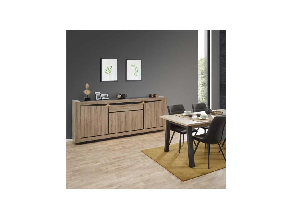 Mettant en avant un revêtement Chêne naturel au veinage plus vrai que nature et des éléments décor béton ciré au rendu très probant cette belle et majestueuse enfilade promet un fort impact visuel dans votre coin repas.