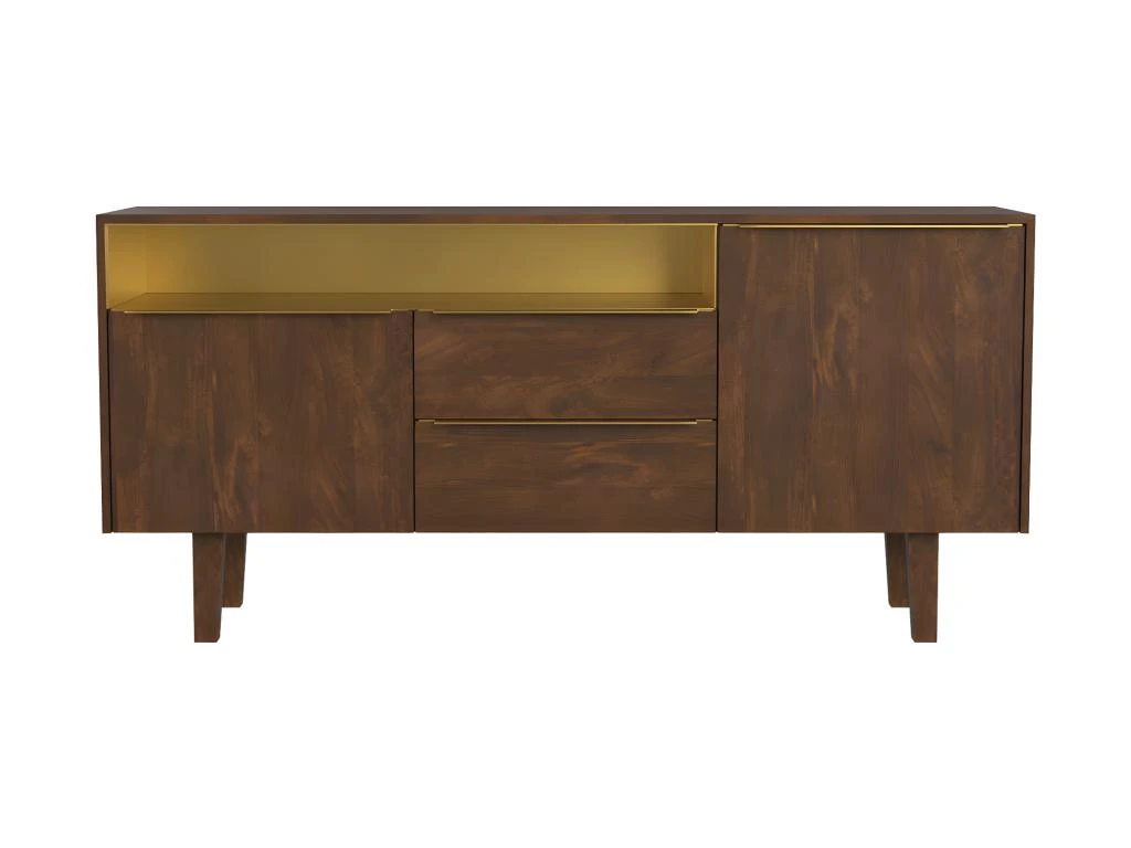 Grâce à ses deux tiroirs, notre buffet Taiko en bois foncé et couleur laiton vous permettra des rangements toujours bienvenus. Avec ses deux portes, il est parfaitement conçu pour recevoir de la vaisselle, si vous projetez de l’intégrer à votre salon et dans un espace repas.
