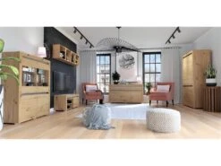 Buffet 180cm Avec LED Intégrées Collection ASSIA. Coloris Vert Et Chêne. 2 Portes Et 4 Tiroirs.