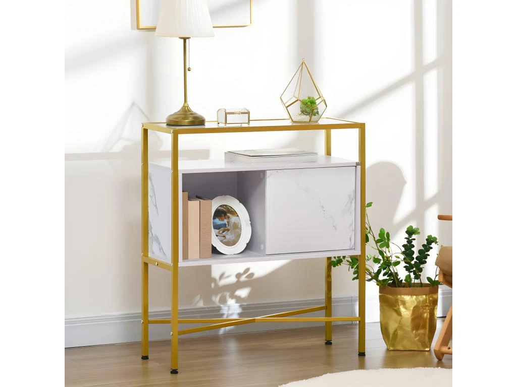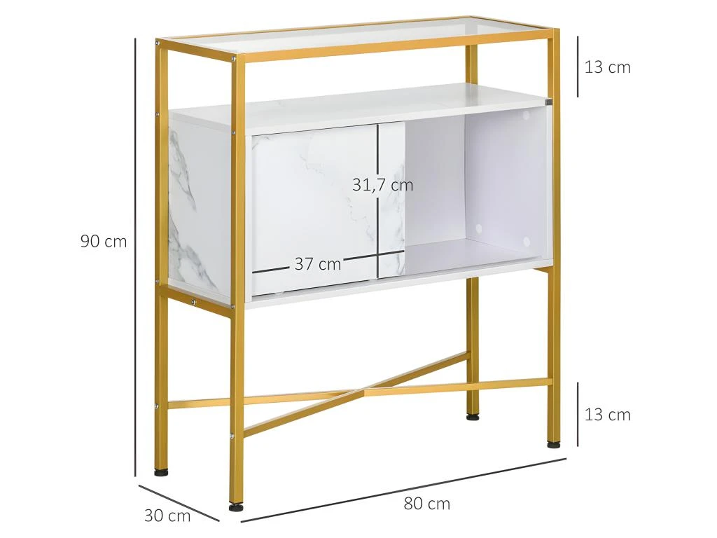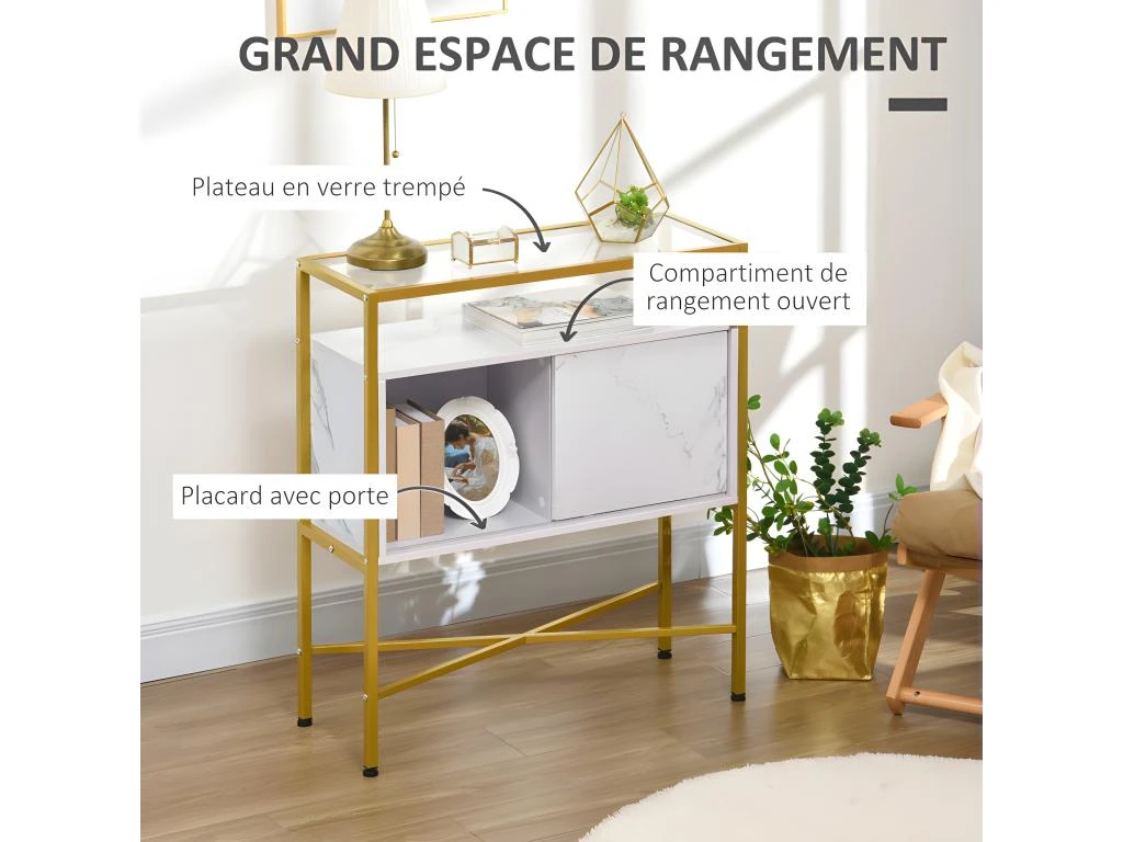 – Table console style Art déco mélant avec élégance l’acier doré (châssis, piètement), l’aspect marbre blanc, le verre trempé