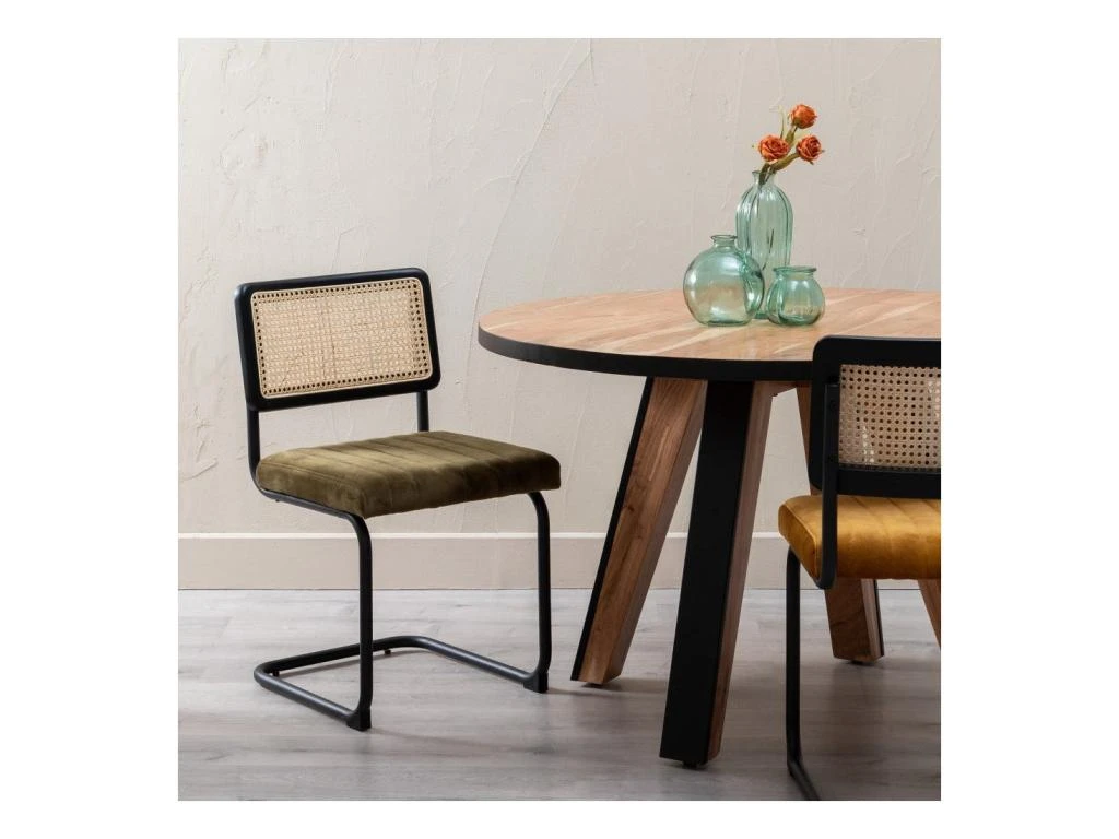 Focus sur la structure fine et élégante, les surpiqures et sur le dossier cannage tressé qui offrent un souci du détail valorisant ainsi qu’une belle qualité perçue.