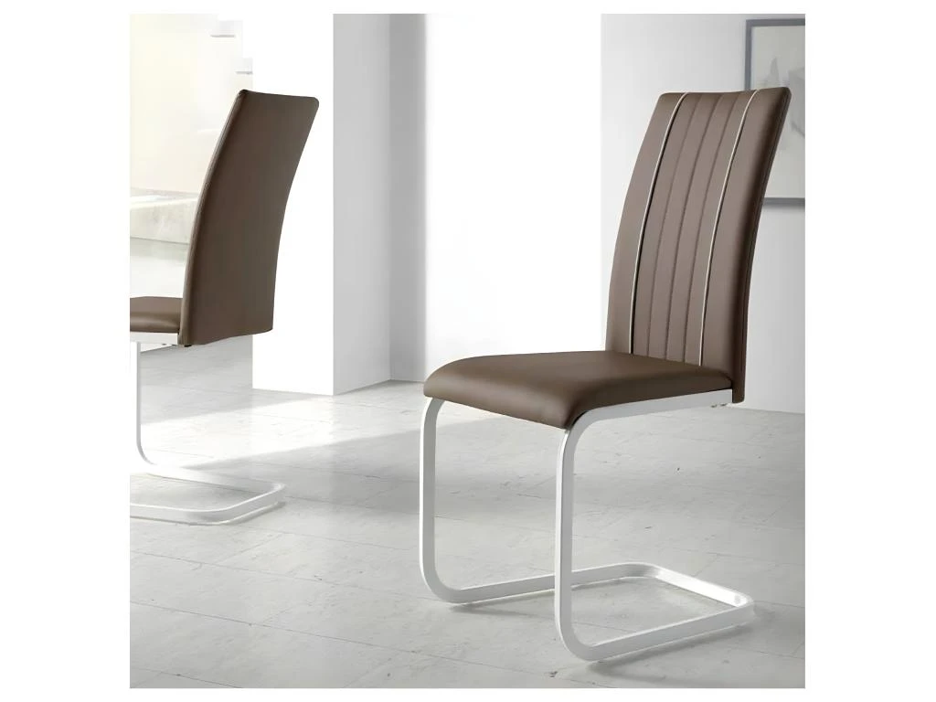 Le revĂȘtement en Ă©co-cuir marron foncĂ© offre une entretien aisĂ© et une qualitĂ© perçue premium, le souci du dĂ©tail est prĂ©sent grĂące aux coutures dĂ©coratives blanches qui mettent en relief ce lot de chaises facile Ă marier avec une table moderne ou mĂȘme une table plus classique.