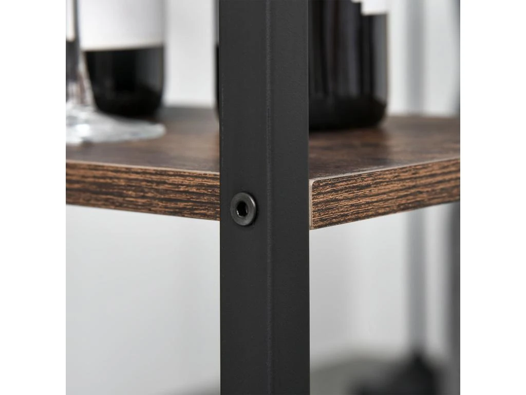 – Jolie mixité des matériaux : plateau, étagères et assises aspect vieux bois avec veinage, structure et piètement en métal noir