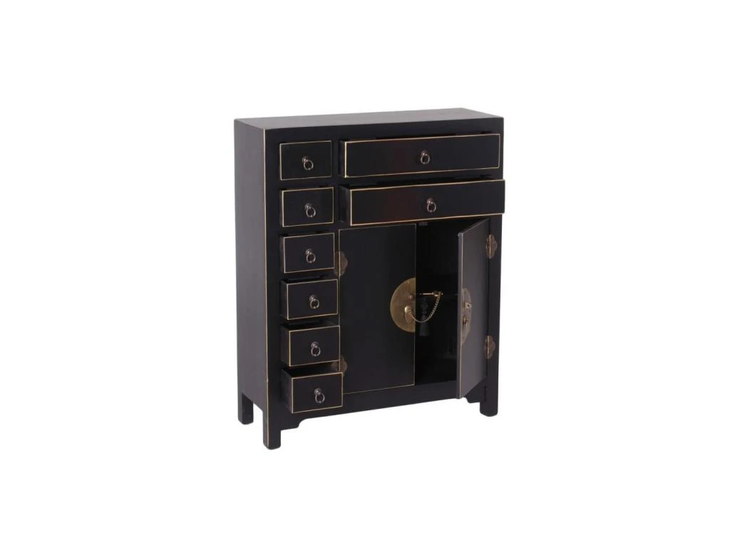 La teinte noire se marie à la quincaillerie dorée, parfaitement raccord avec le style oriental de ce meuble multifonction sobre et élégant.