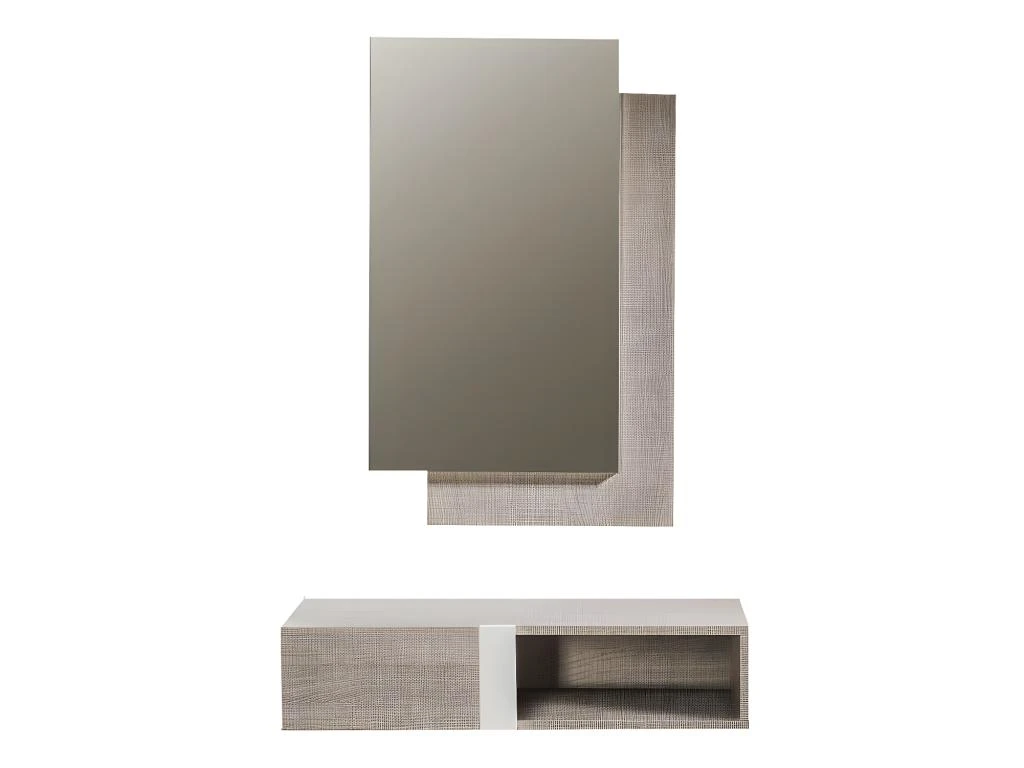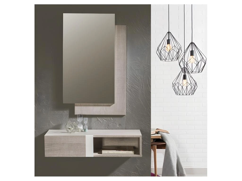 Le miroir au dessin contemporain offre un rendu contemporain à ce meuble d’entrée robuste et de qualité perçue haut de gamme.