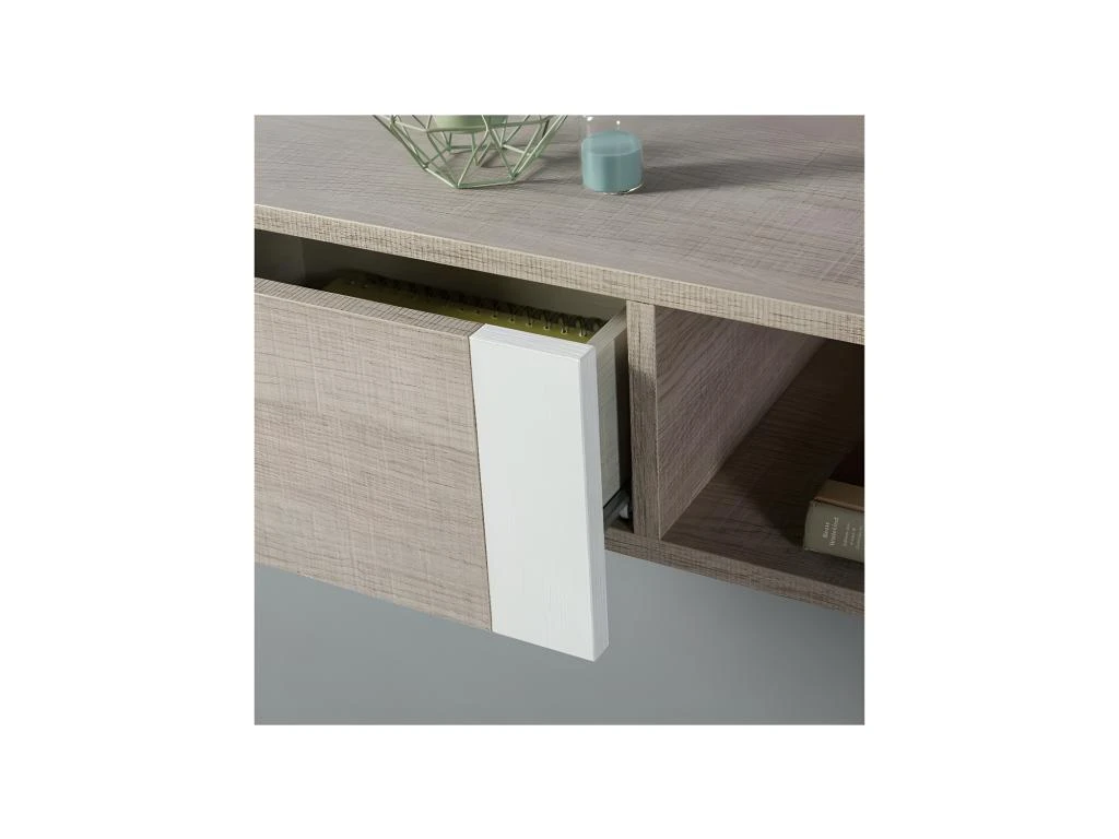 Le tiroir est dépourvu de poignée et se manipule grâce au débord de façade proposant un élément de préhension de teinte blanche.