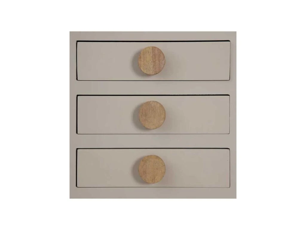 Reposant sur une structure en bois de Paulownia légèrement cérusé blanc le corps de ce meuble de complément est revêtu d’une laque Taupe qui apportera luminosité et chaleur dans votre entrée ou votre salon.