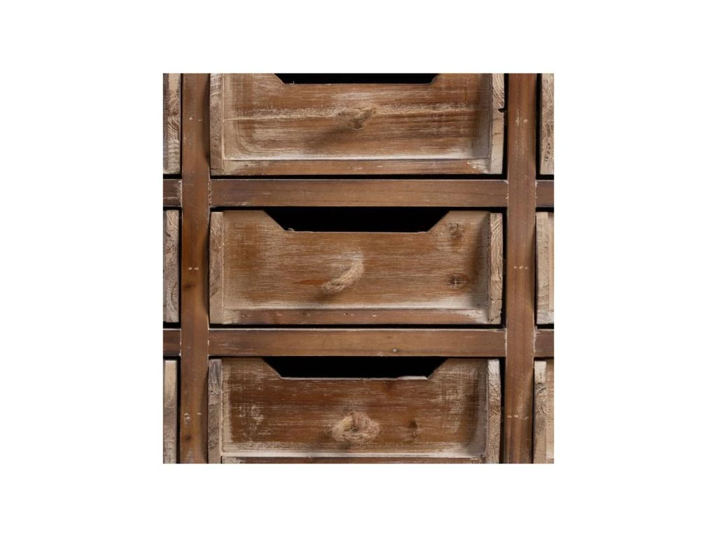 Réalisé en bois de Sapin teinte Brune patinée ce meuble de complément est pourvu de détails originaux et valorisants, ainsi les poignées en cordage se marient à des façades de tiroir originales pour une signature visuelle unique en son genre.