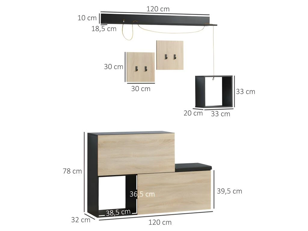 – Dim. meuble à chaussures : 120L x 32P x 78H cm