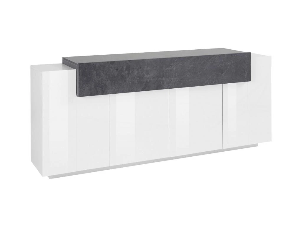 STRUCTURE ET UTILISATION – Buffet de salon pratique et peu encombrant structuré avec quatre portes battantes de différentes tailles et une porte abattante centrale, des compartiments internes et un tiroir dans la partie supérieure – Les portes et les tiroirs sont sans poignées, tous deux équipés de charnières solides et de guides métalliques – La structure est entièrement en blanc brillant avec des détails Ardoise – L’étagère du haut est parfaite pour ranger votre téléviseur ou vos bibelots préférés.