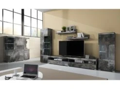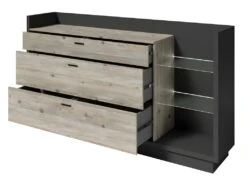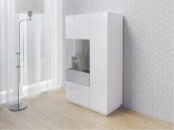 Buffet Haut Avec LED Collection KILES Deux Portes. Coloris Blanc Et ChĂȘne. Porte VitrĂ©e Ă Droite