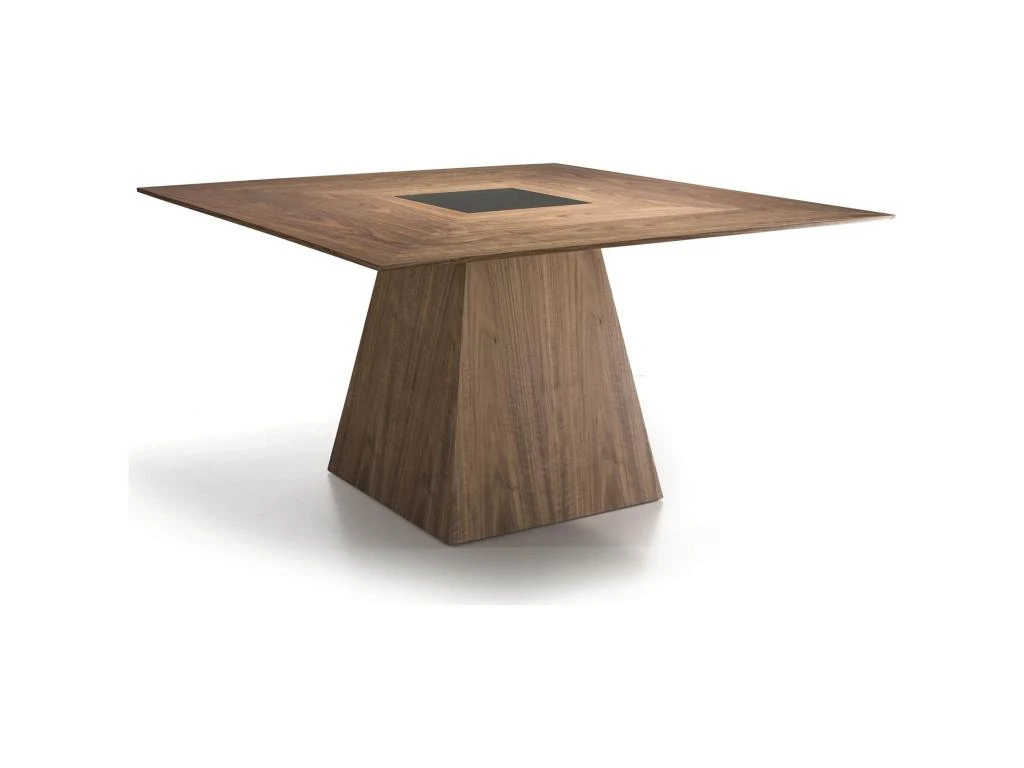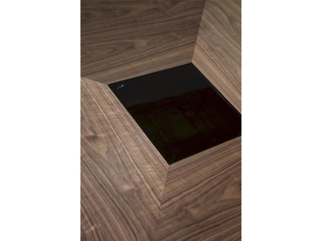Matière : plateau et pied : dm plaqué en bois de noyer naturel, épaisseur 0,5 mm, détail central : verre teinté noir 8 mm ,