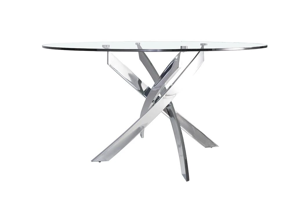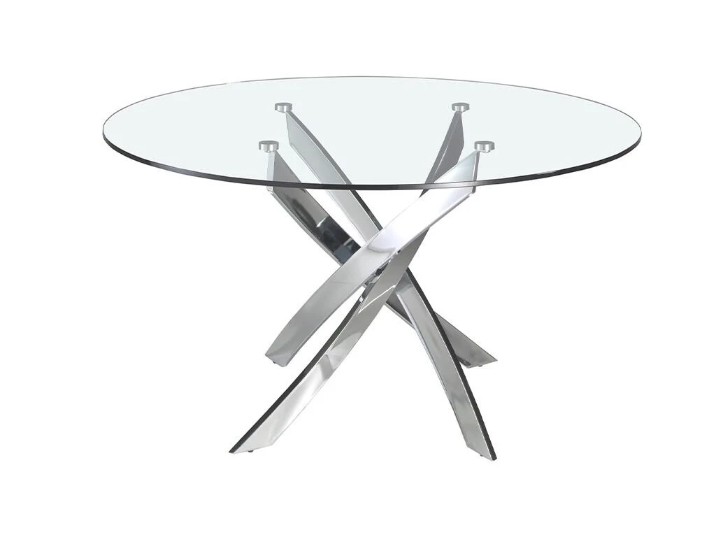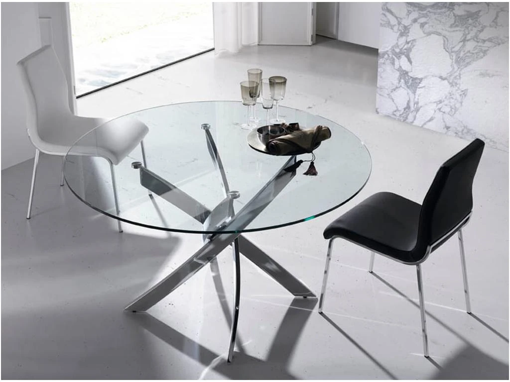 Table de salle à manger ronde au design moderne avec plateau fixe en verre trempé de 12mm et bords polis. Sa base originale en acier inoxydable chromé de 22 microns est l’un des éléments clés de son design. Une table parfaite pour apporter de la luminosité et de l’avant-garde à votre cuisine, votre salon ou votre salle à manger.
