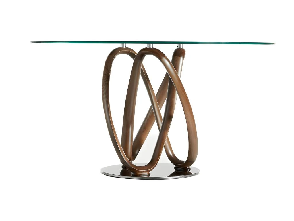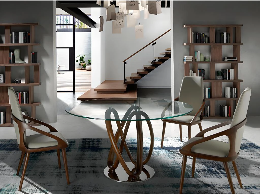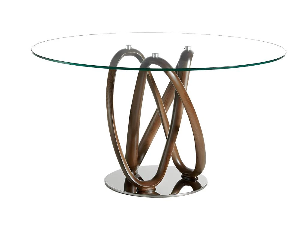 Table à manger de style moderne avec plateau en verre trempé rond fixe de 12 mm et bords polis. La structure spectaculaire en bois de frêne massif peint en couleur noyer, apportera chaleur et avant-garde à votre pièce. De plus, grâce à ce pied original en bois de noyer, la sensation d’espace et de lumière sera beaucoup plus grande. Chaque détail est pensé pour vous offrir le plus grand confort et stabilité, d’où son pied en acier massif chromé de 22 microns