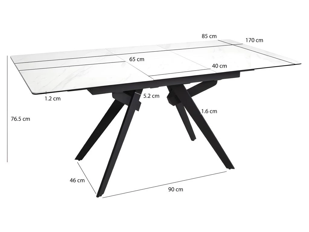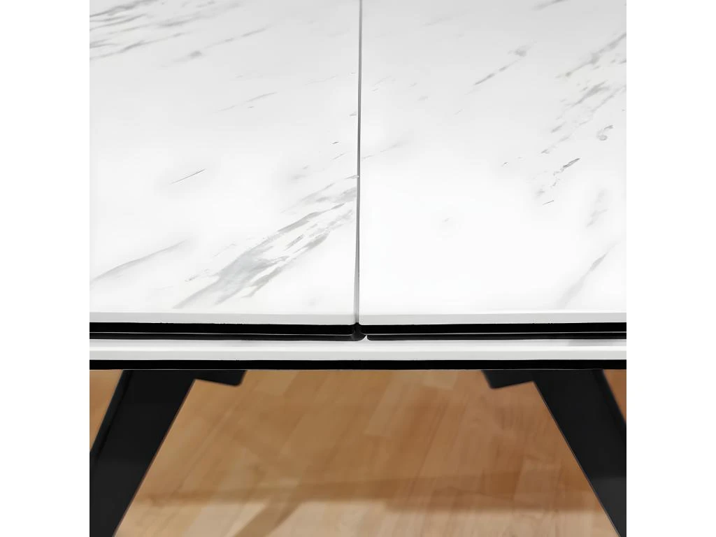 - PRODUIT : Table de repas extensible 130/170 cm plateau en céramique blanc marbré et pieds évasés en métal noir LAUREL.