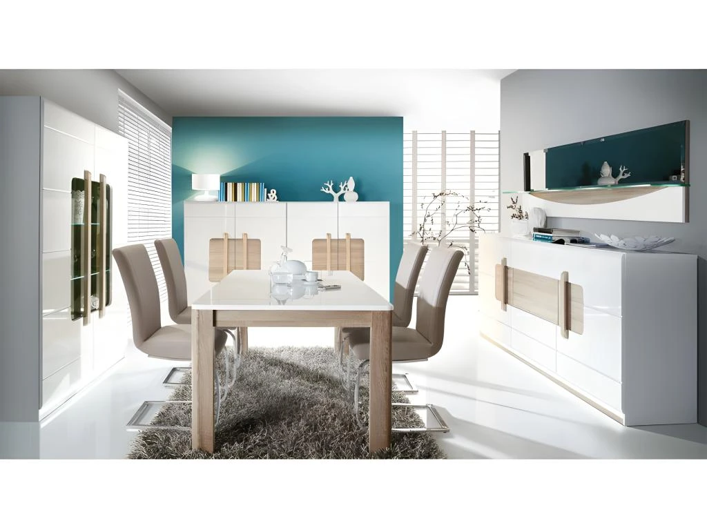 Une table de repas extensible avec allonge couleur chêne, qui peut accueillir généreusement 8 personnes autour de son plateau.