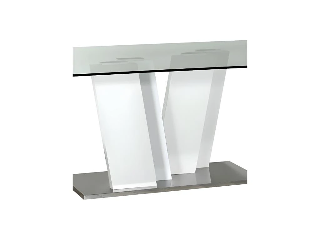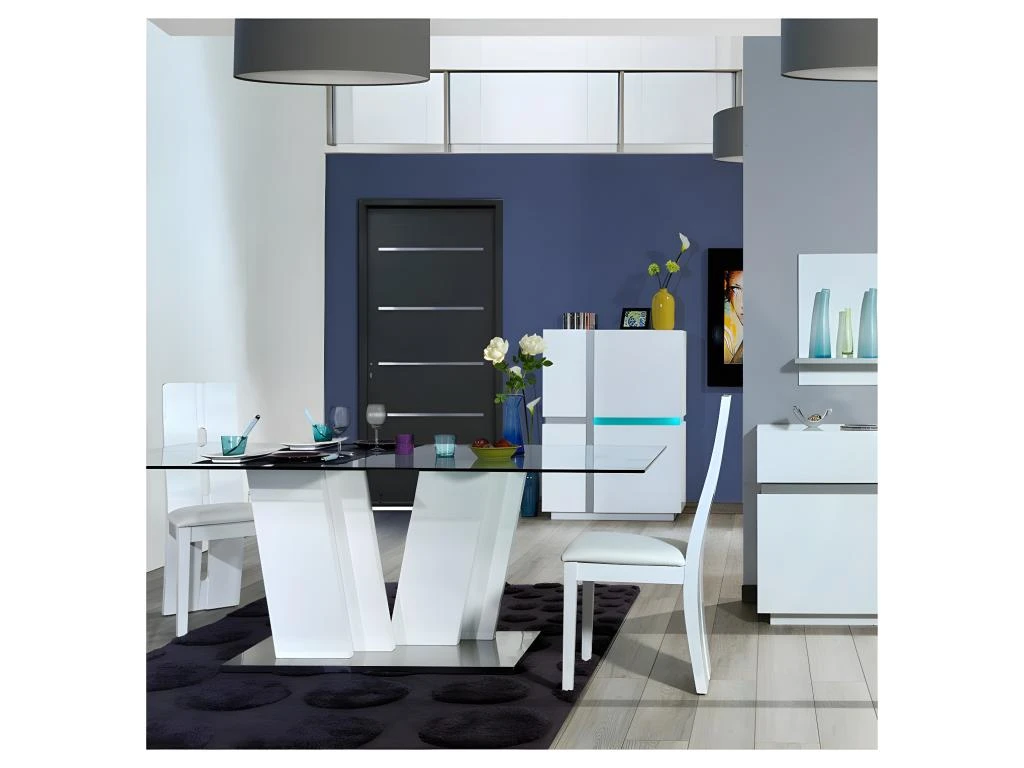 Table de repas au plateau verre de 6 Millimètres d’épaisseur dont le piétement original en V présente une finition laquée blanc brillant.