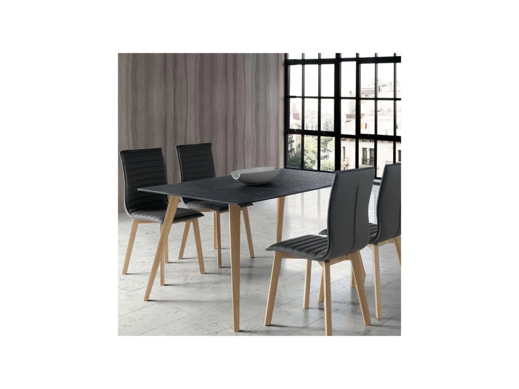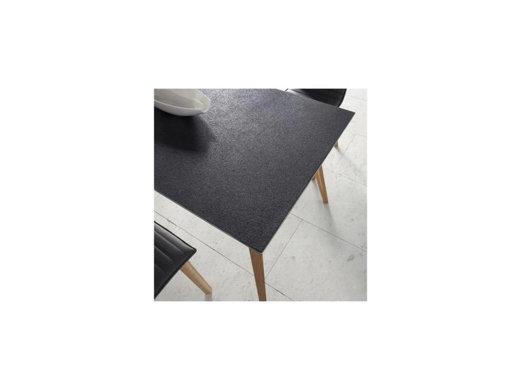 La finesse du plateau réalisé en verre structuré aspect pierre est parfaitement mis en valeur par les pieds en chêne massif.