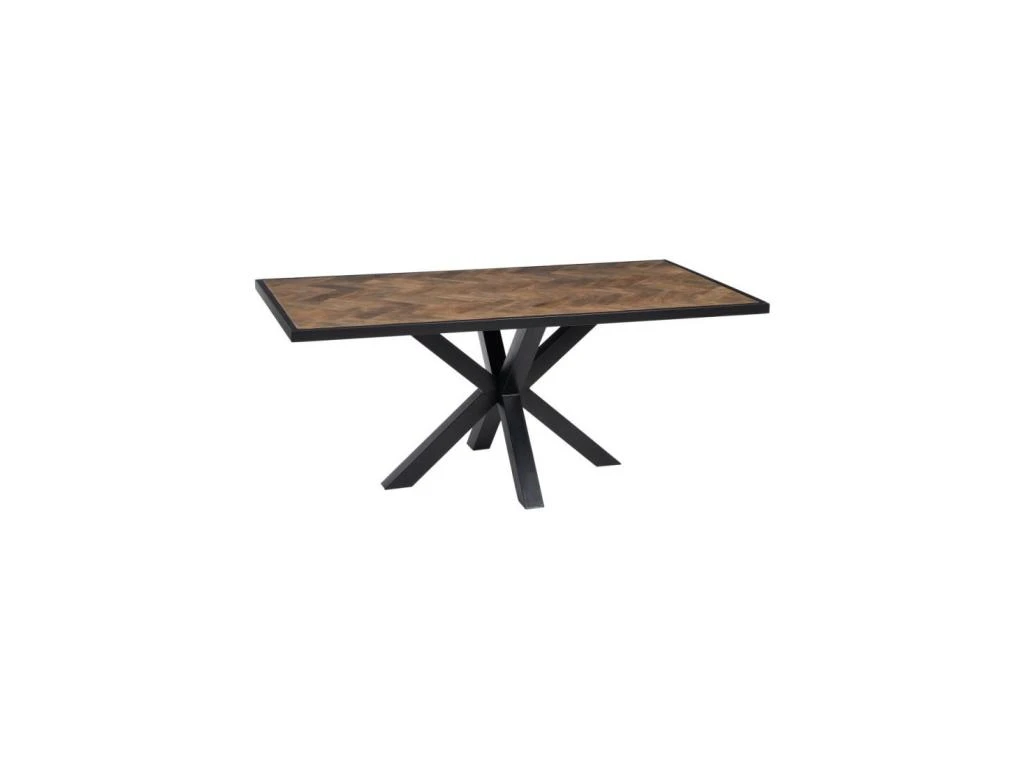 Sculpturale table de repas rectangulaire réalisée en bois de Manguier et proposant un spectaculaire plateau en parquetage de bois.
