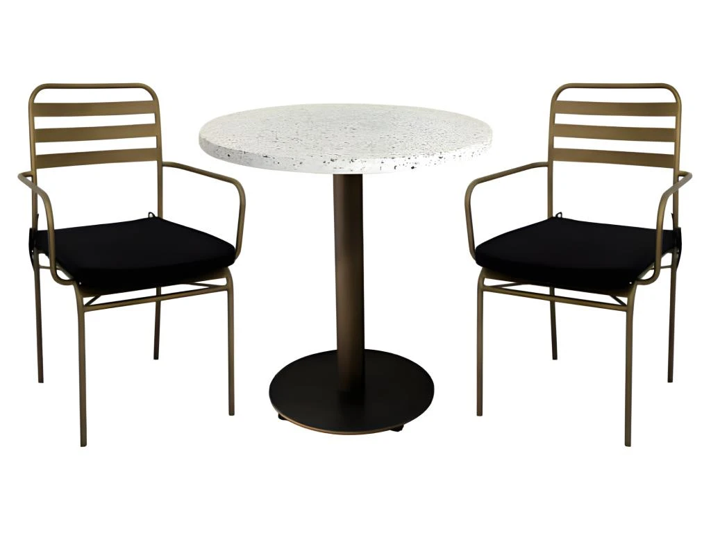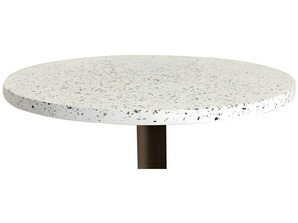 Le plateau est en ciment blanc poli avec incrustations de marbre plus ou moins colorés. C’est le grand retour de ce matériau, appelé « Granito » ou « Terrazzo ». Très apprécié dans les années 60, il revient en force de nos jours grâce à sa facilité d’entretien et son esthétique particulière. La table Terrazzo Bronze agrémentera votre intérieur et trouvera également sa place dans vos espaces extérieurs.